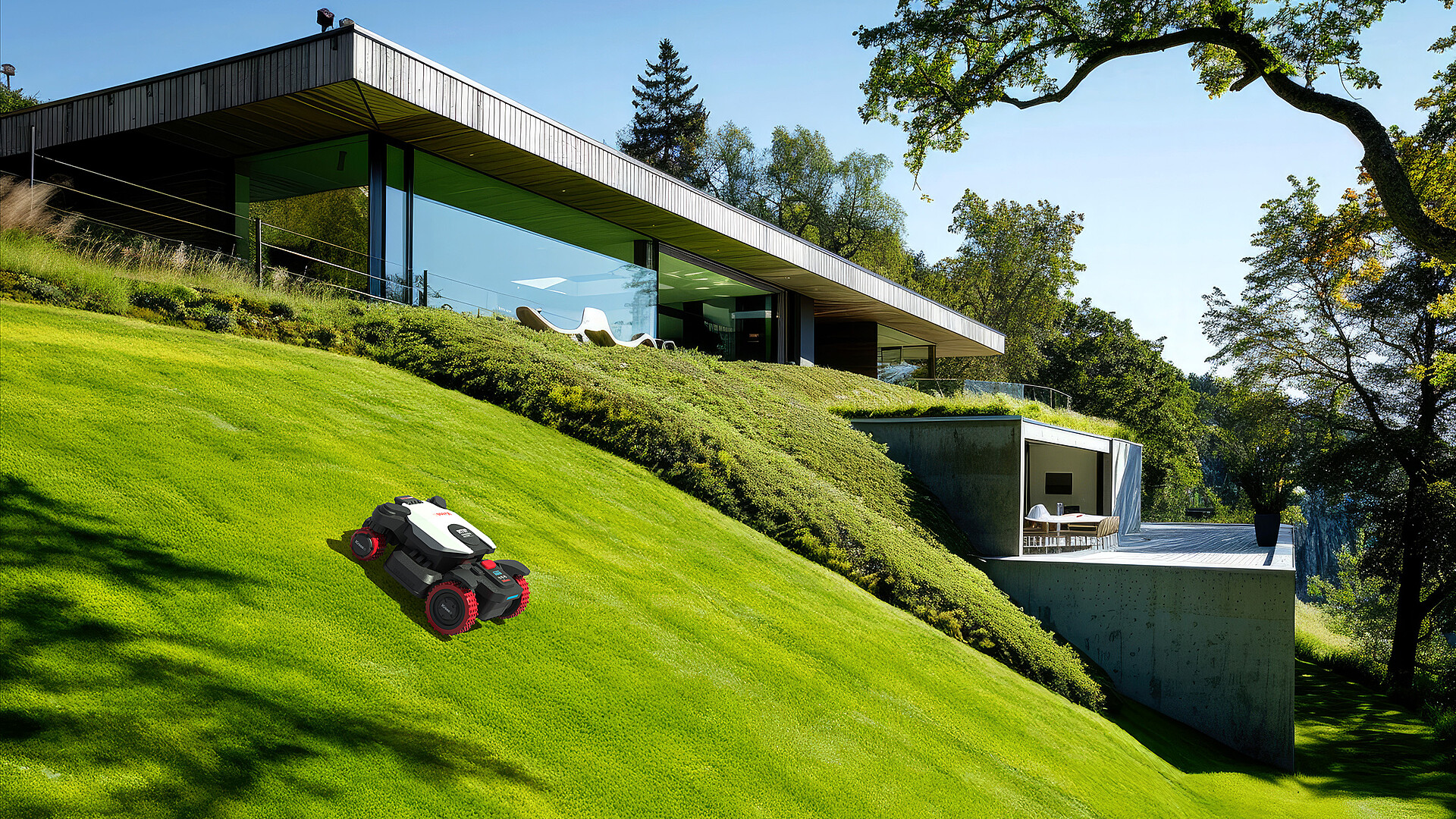 - Zijdelings maaien op hellingen: de vierwielaandrijving zorgt voor stabiele, nauwkeurige maaistrepen zonder weg te glijden.